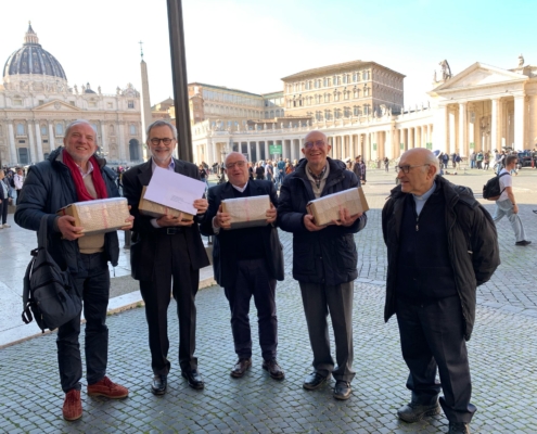 Massimo Vincenzi a Roma per la consegna dei pacchi al Dicastero (4 marzo 2025) (da sin. Maurizio Ori, Massimo Vincenzi, Gerardo Capriglione, Giovanni Nicolini, don Franco Borsari)
